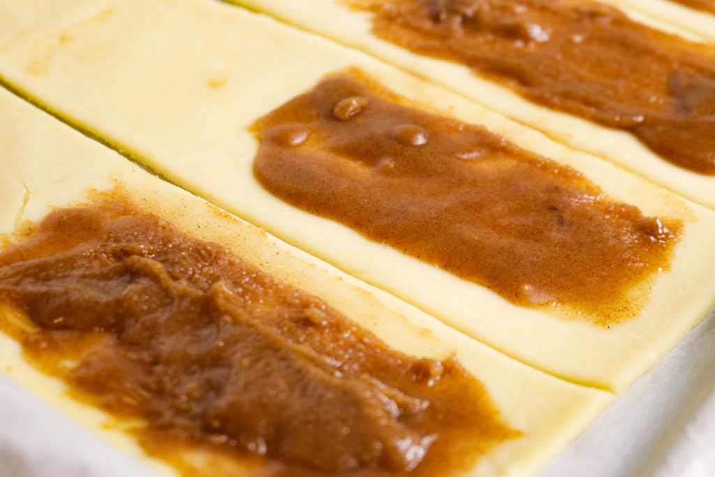 Remove the dough from the fridge and begin spreading the filling on half of each strip of dough leaving 1/2 inch space around the side to prevent oozing. Once the pop-tart is filled halfway up the strip, fold the remaining dough down to form a rectangle. Using your fingers, lightly press the edges closed all the way around.